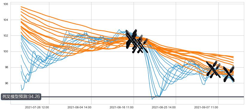 ➣ 200小时均线于(08-13 15:00: 101.44)形成【死叉】基于【死叉历史模型】预测死叉后最低波谷价格: 96.34, 死叉后最低价格93.41,已经下跌超出预测最低波谷价格, 预期反弹