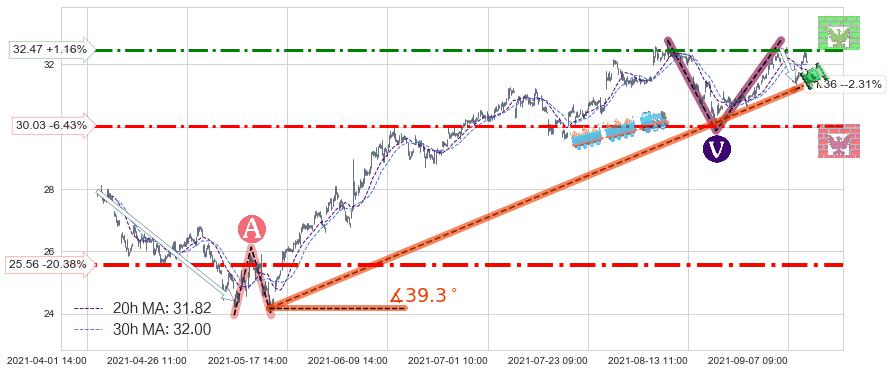 🍖 长线趋势跟踪组合短线均值回复[强支撑信号]2021-05-13 10:00-2021-09-08 09:00上升趋势依然成立(上涨趋势跟踪依然可行),短线价格略微下行回调(均值回复猜想),即将接近趋势提供的未破位的支撑价格:31.36。