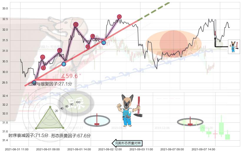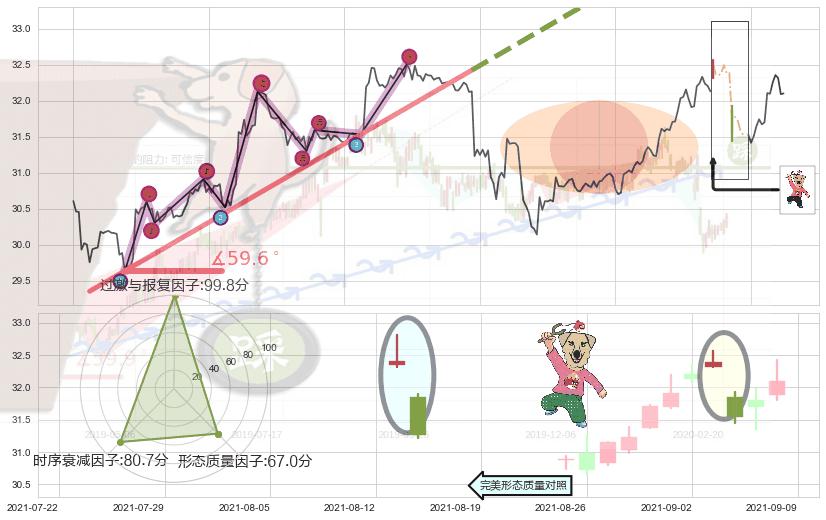 ➢ 2021-07-15 12:00-2021-08-13 15:00上升趋势存在反转[风险],其原上升趋势的支撑位(34.93)已破位[强阻力信号],原上升趋势角度: 59.6˚