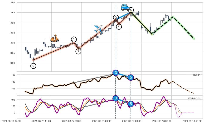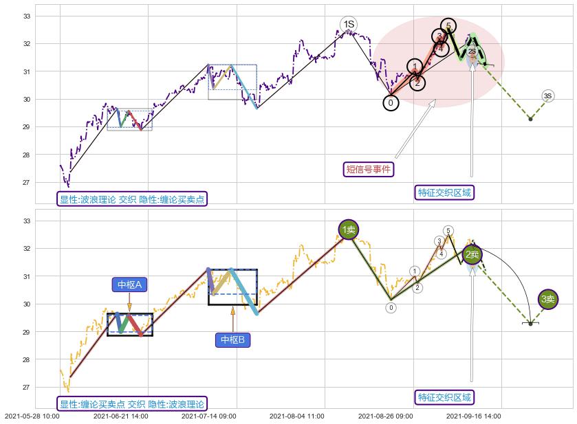 ➣ 缠论买卖点:猜想2卖持续蓄力下跌至3卖 → 下跌 → 风险信号 → 小趋势跟踪