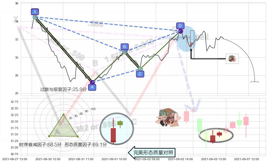 ➢ 🕰 价格走势在2021-09-03 11:00:00至2021-09-03 12:00:00期间形成顶部尽头线(下山虎),残存影响值:-3.78