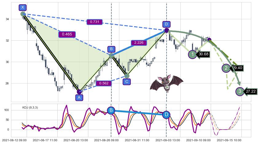 ➣ 已完成【蝙蝠】形态起点X: 08-11:12, 终点D: 09-02:10, 共95交易小时
