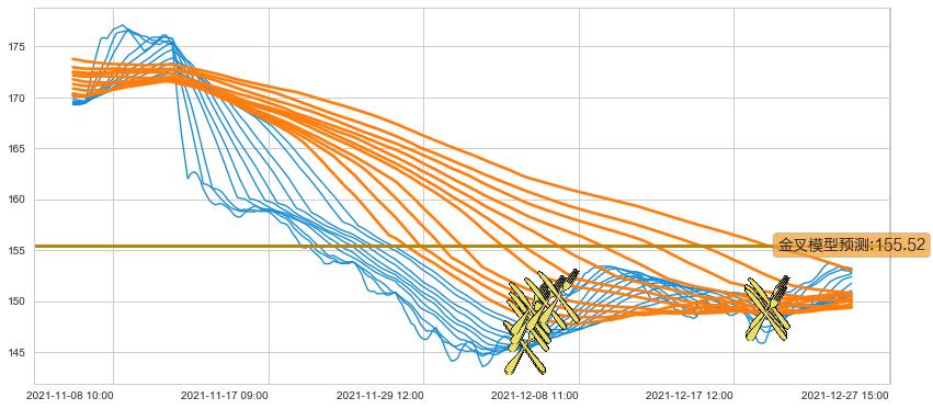 ➣ 120小时均线于(12-20 15:00: 148.72)形成【金叉】基于【金叉历史模型】预测金叉后最高波峰价格: 155.97, 金叉后最高价格154.05,尚未达到预测最高波峰价格, 预期继续上涨