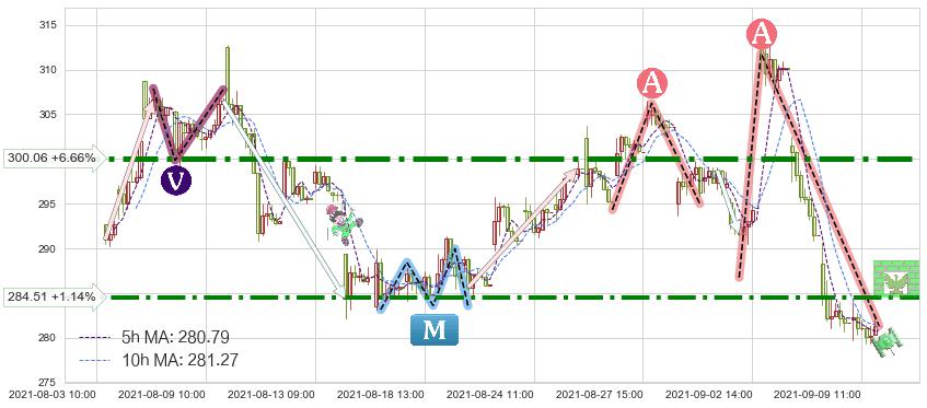 ♘ 阻力价格位284.51,可信任强度79.56%,距离最后交易2021-09-09 15:00形成的收盘价格281.31相差 +1.14%
