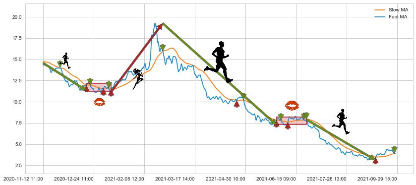 05-27 12:00至06-23 13:00 慢线与快线多次接触,存在上下穿越,有缠绕