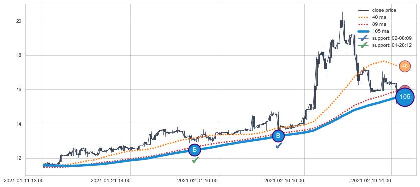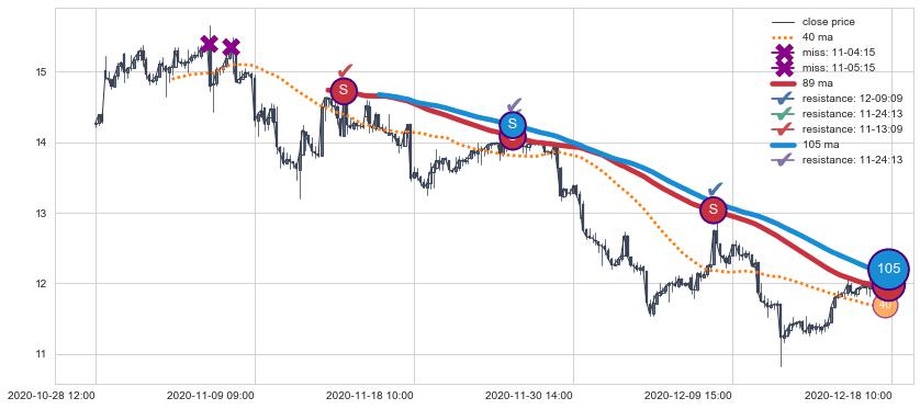 ➢ 最优均线组合共正确确认支撑阻力信号7处,正确确认率 43.75%