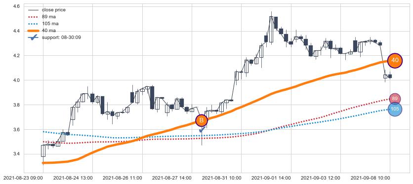 ➢ 90小时均线于(08-23 11:00: 3.495)形成【金叉】基于【金叉历史模型】预测金叉后最高波峰价格: 5.41, 金叉后最高价格4.52,尚未达到预测最高波峰价格, 预期继续上涨