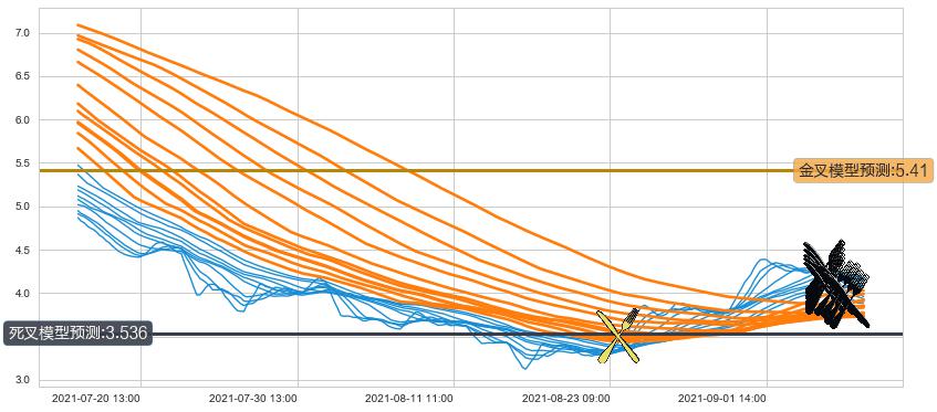➢ 21小时均线于(09-07 14:00: 4.28)形成【死叉】基于【死叉历史模型】预测死叉后最低波谷价格: 3.926, 死叉后最低价格3.865,虽然已经到达预测最低波谷价格,但耗时间很短动能很强, 预期继续下跌