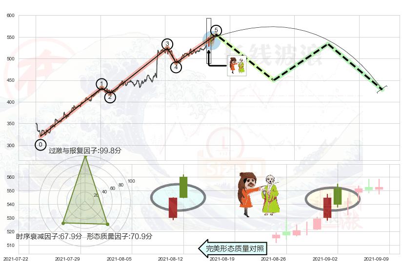 从2021-05-13 12:00至2021-09-09 15:00,共包含554个小时,阶段股价上涨56.04%,阶段股价变动位移路程比: 1 : 4