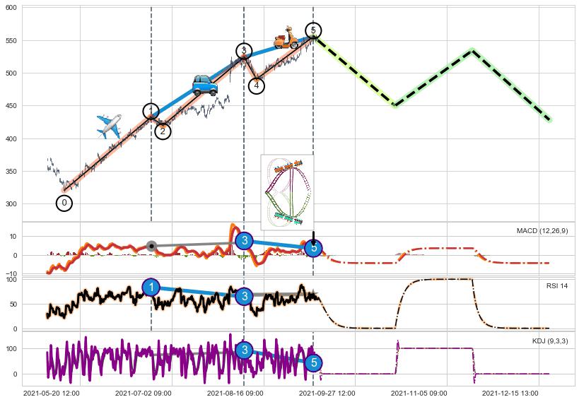 ➣ 顶部尽头线(下山虎) + 波浪理论上涨浪:浪5回调拐点信号叠加后【反向回撤率】高,【看空】信号叠加【存续影响小】