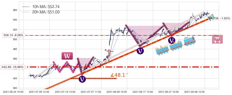 ♘ 在最后的上升阶段2021-06-29 10:00至2021-09-09 14:00存在 持续未破位的支撑位 ,支撑价格542.56,支撑可信任强度87.36%,其距离最后价格552.66相差 -1.83%