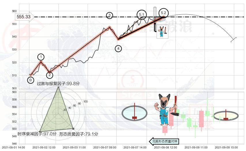 ➣ 5.1: 预测当前第5浪位置(09-08:11, 555.28),仍然有上升空间