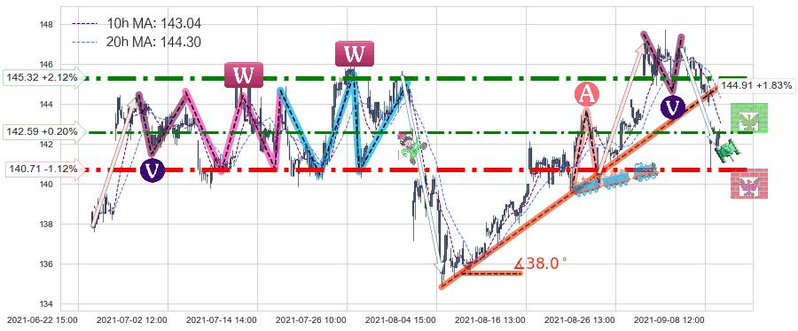 ♞ 10小时均线:143.04,20小时均线:144.30→ 快线<慢线