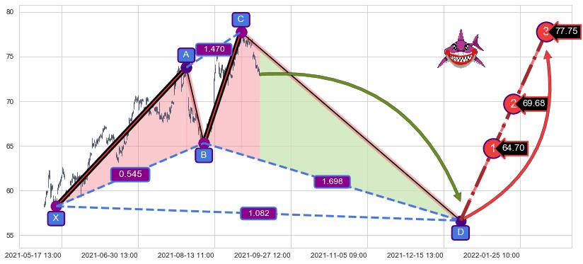 ➢ 谐波鲨鱼:b持续蓄力上拉击穿越过c:猜想泄力性下沉 → 下跌 →【拐点】强阻力临近 → 大趋势均值回复