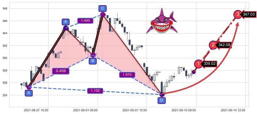 ➣ 谐波鲨鱼:已到达d点:猜想c下行到达d点后报复性拉升上涨(均值回复)