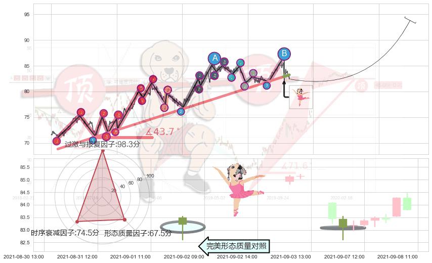 ♘ 在最后的上升阶段2021-04-12 09:00至2021-09-03 14:00存在 破位边缘的支撑位 ,支撑价格83.23,支撑可信任强度78.08%,其距离最后价格82.43相差 +0.98%