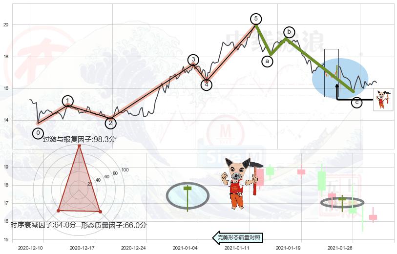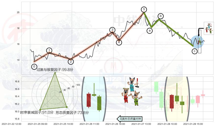 从2021-01-15 16:00至2021-01-28 16:00,共包含65个小时,阶段股价下跌-9.61%,阶段股价变动位移路程比: 1 : 7