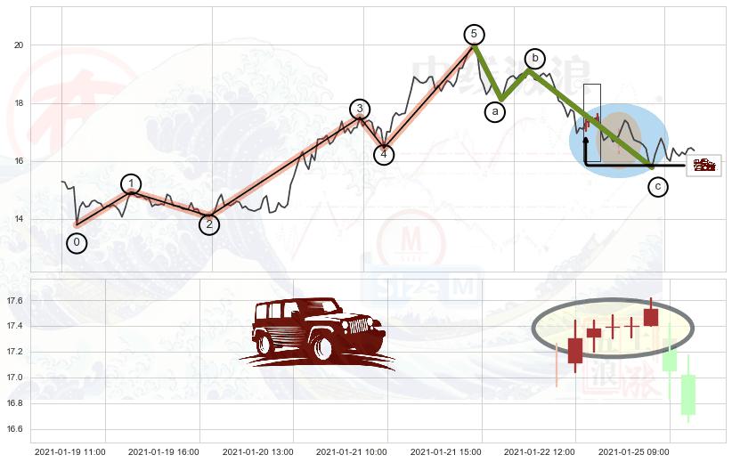 ➢ 波浪理论:猜想击穿破位c点后继续下跌 → 下跌 → 风险信号 → 小趋势跟踪