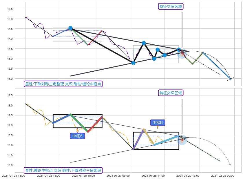 ➢ 下降对称三角整理与缠论中枢点信号事件周期长度级别相同,同周期信号事件