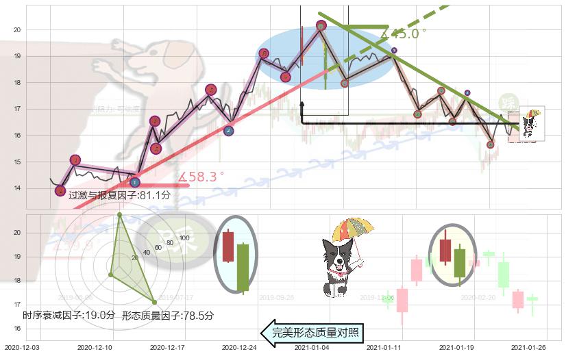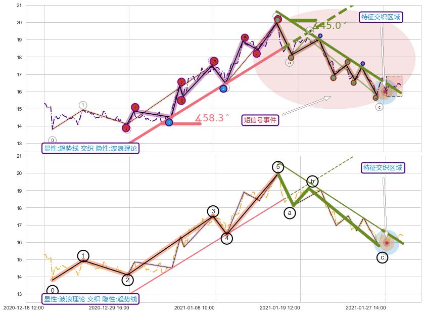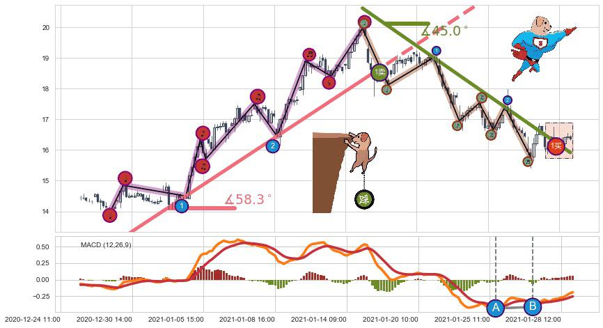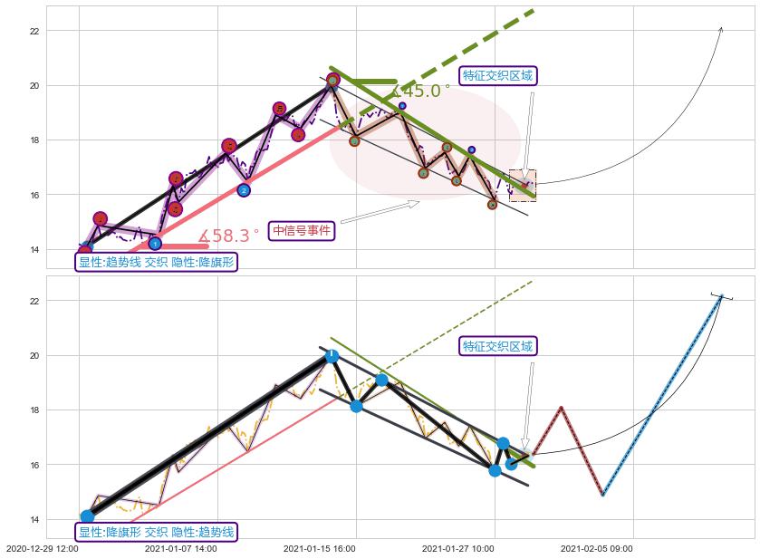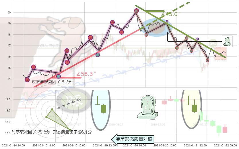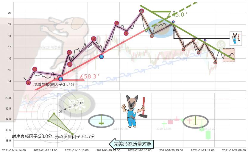 从2021-01-14 15:00至2021-01-27 12:00,共包含62个小时,阶段股价下跌-18.33%,阶段股价变动位移路程比: 1 : 3,下跌趋势角度: 45.0