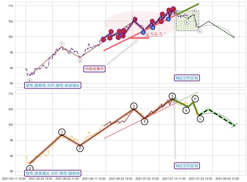➢ 2021-06-11 10:00-2021-07-12 10:00上升趋势存在反转[风险],其原上升趋势的支撑位(110.50)已破位[强阻力信号],原上升趋势角度: 59.5˚