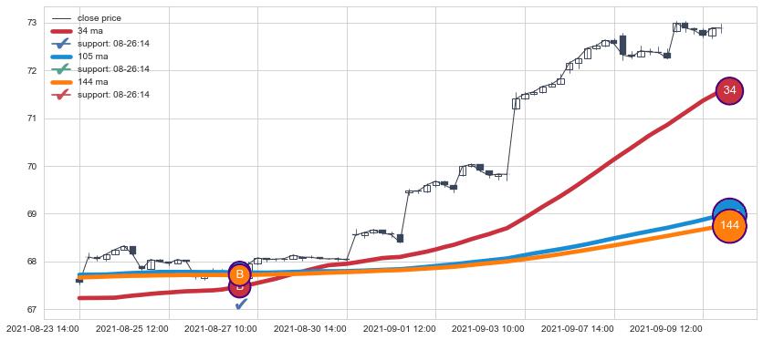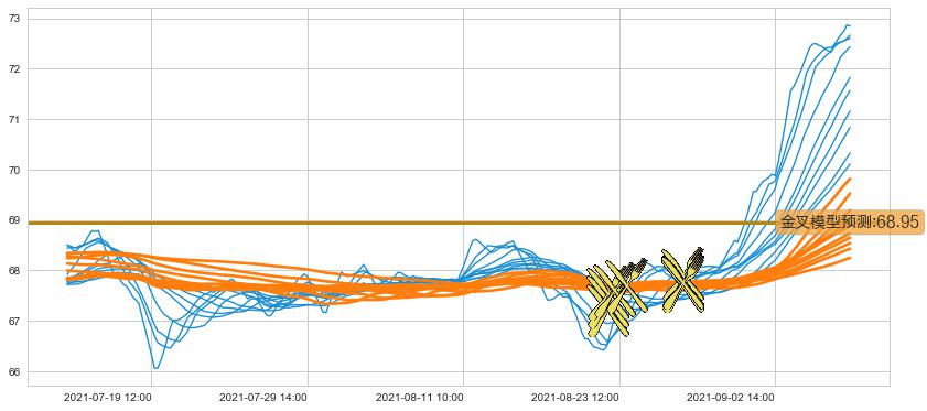 ➣ 70小时均线于(08-26 14:00: 67.73)形成【金叉】基于【金叉历史模型】预测金叉后最高波峰价格: 68.80, 金叉后最高价格72.99,已经上涨超出预测最高波峰价格, 预期回调