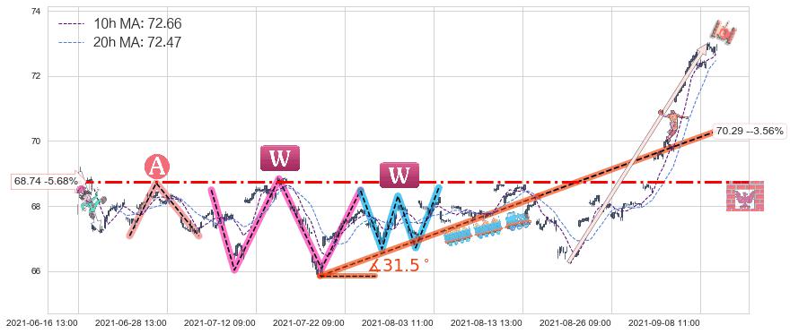 2021-08-11: 第一支撑位68.74强力阻拦了上升趋势,成功阻止了价格的继续上涨。