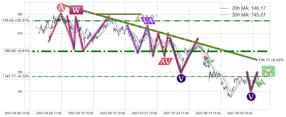 ♘ 阻力价格位147.77,可信任强度41.99%,距离最后交易2021-09-09 14:00形成的收盘价格146.74相差 +0.70%