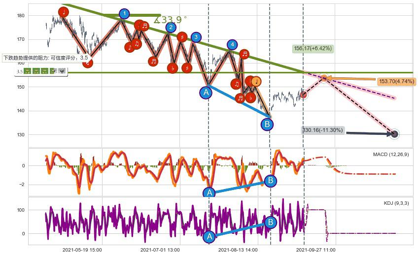 ♘ 在最后的下跌阶段2021-04-28 09:00至2021-08-23 14:00,存在 持续未破位的阻力位 ,阻力价格156.17,可信任强度81.42%,其距离最后价格146.74相差 +6.42%