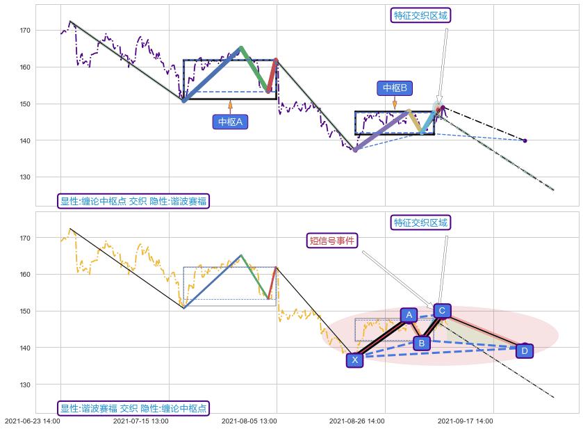 ➣ 缠论中枢点:猜想破位中枢B后持续下拉 → 下跌 → 破位中枢B支撑 → 持续趋势跟踪