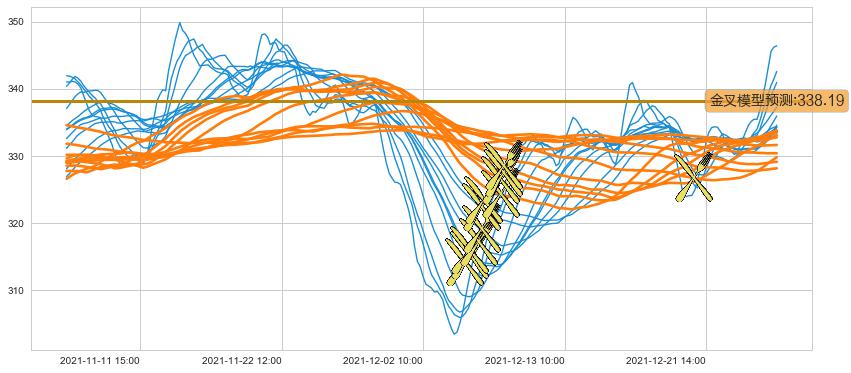 ➣ 120小时均线于(12-21 09:00: 326.73)形成【金叉】基于【金叉历史模型】预测金叉后最高波峰价格: 342.20, 金叉后最高价格347.34,已经上涨超出预测最高波峰价格, 预期回调