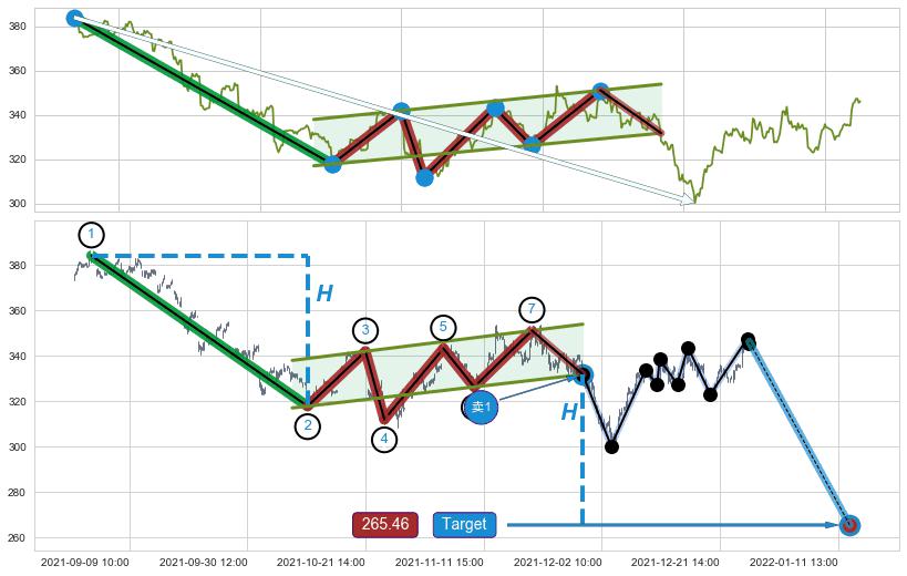 ➣ 最小中继整理跌幅→𝐇: 66.33 (𝐇旗杆的长度:旗杆起点→顶点)