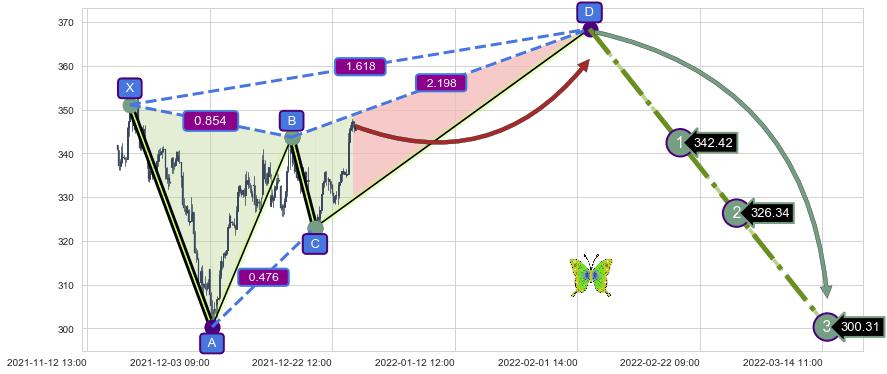 ➣ 谐波蝴蝶:b下跌接近c:猜想支撑性拉升 → 上涨 →【拐点】支撑临近 → 大趋势均值回复