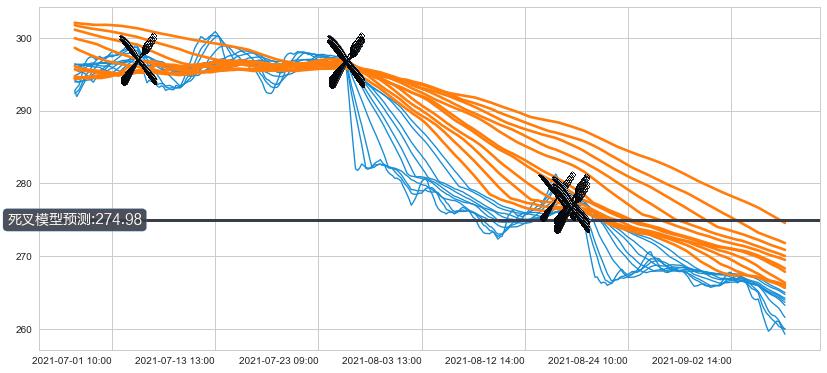 ➣ 30小时均线于(08-17 15:00: 277.70)形成【死叉】基于【死叉历史模型】预测死叉后最低波谷价格: 269.32, 死叉后最低价格257.99,已经下跌超出预测最低波谷价格, 预期反弹