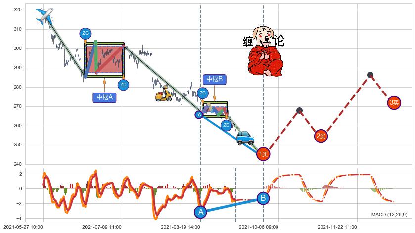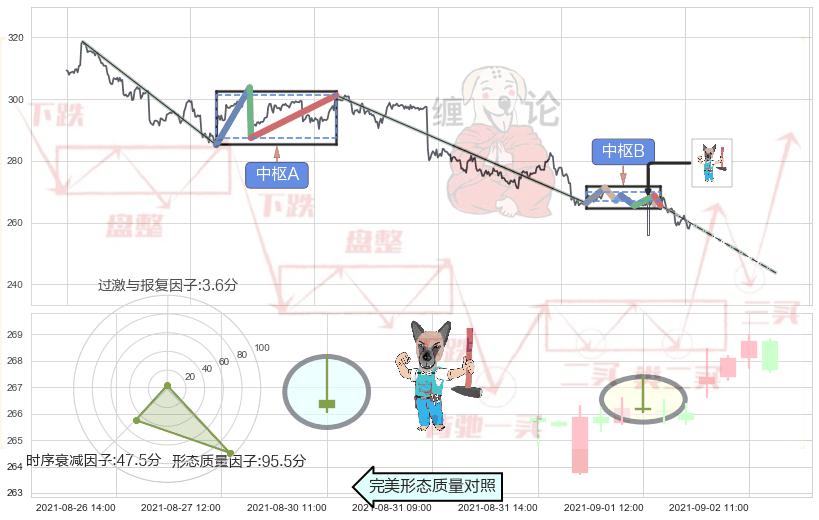 ➣ 缠论中枢点:下降缠中枢B破位后距离1买距离较远,随后猜想后续持续下跌(趋势跟踪)