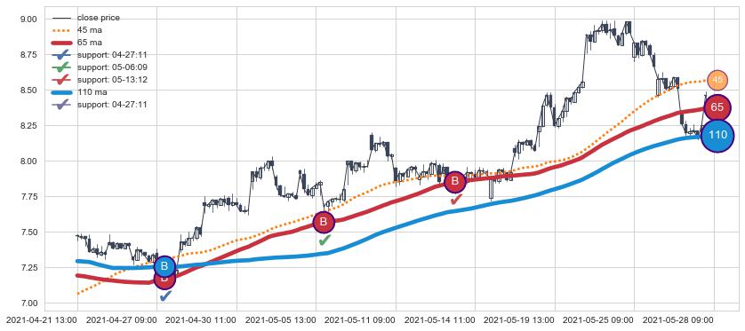 ➢ 最优均线组合共正确确认支撑阻力信号11处,正确确认率 68.75%