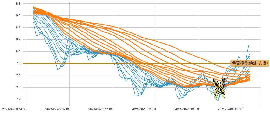 ➢ 90小时均线于(08-31 14:00: 7.43)形成【金叉】基于【金叉历史模型】预测金叉后最高波峰价格: 7.86, 金叉后最高价格8.18,已经上涨超出预测最高波峰价格, 预期回调