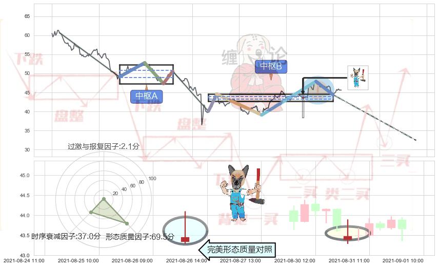 从2021-06-28 11:00至2021-08-23 09:00,共包含237个小时,阶段股价下跌-34.25%,阶段股价变动位移路程比: 1 : 6,下跌趋势角度: 43.5,2021-08-05 09:00向↘︎形成缺口,跳空下跌-18.10%˚