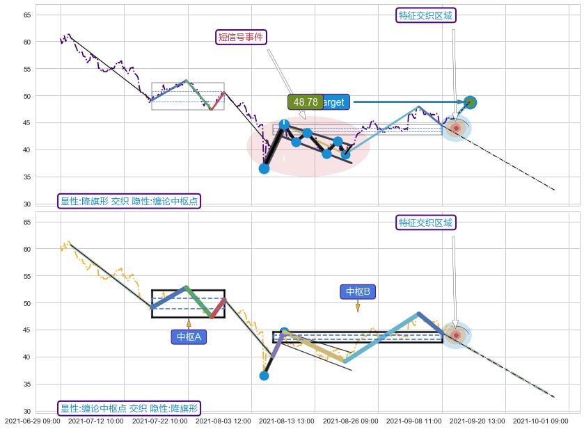 ➢ 缠论中枢点破位中枢B支撑下拉 🔜 降旗形临近target阻力拐点下跌 综合量化分数:45.47 【偏空】