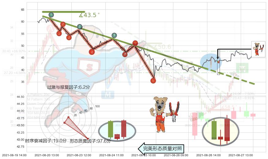 ➣ 2021-06-28 11:00-2021-08-23 09:00下跌趋势存在反转上涨[机会],其原下跌趋势的阻力位(34.01)已被突破[强支撑信号],原下跌趋势角度: 43.5˚