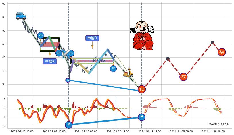 ➣ 缠论中枢点:下降缠中枢B破位后距离1买距离较远,随后猜想后续持续下跌(趋势跟踪)