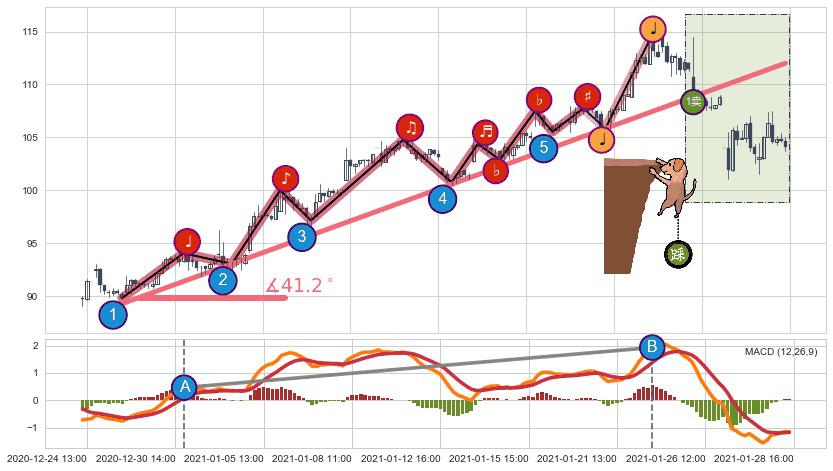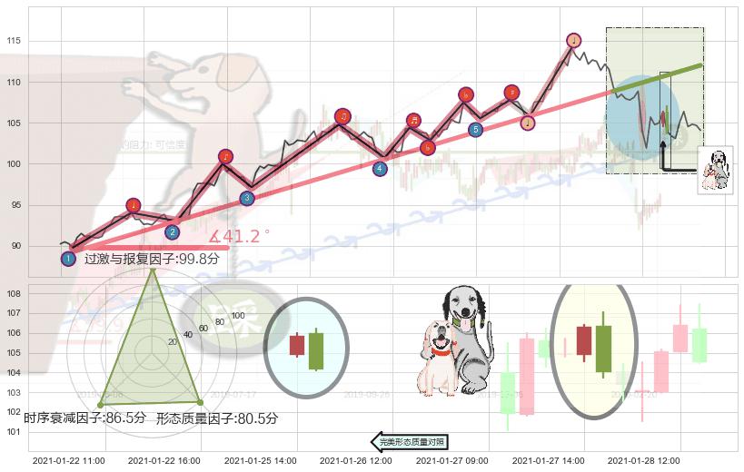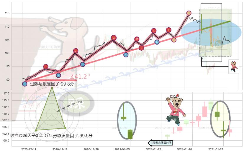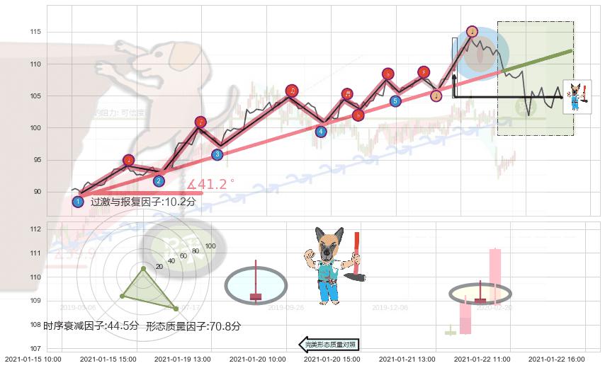 从2020-12-28 16:00至2021-01-20 16:00,共包含109个小时,阶段股价上涨17.69%,阶段股价变动位移路程比: 1 : 3,上涨趋势角度: 42.4