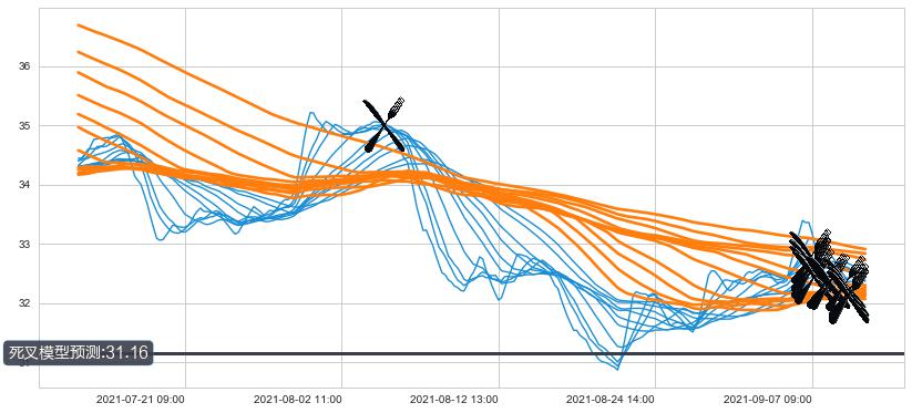 ➢ 70小时均线于(09-08 13:00: 32.32)形成【死叉】基于【死叉历史模型】预测死叉后最低波谷价格: 31.09, 死叉后最低价格31.88,尚未达到预测最低波谷价格, 预期继续下跌