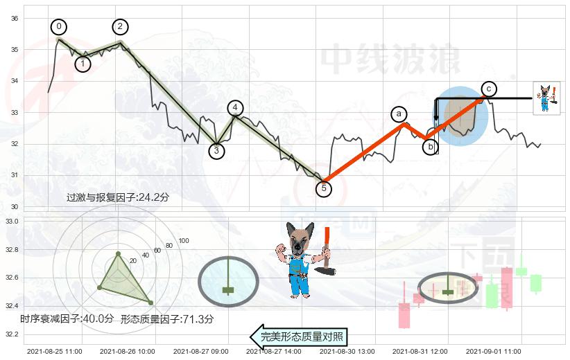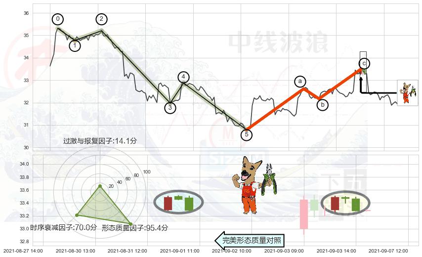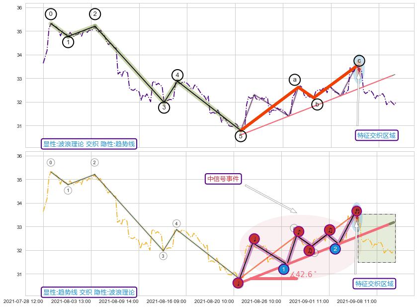 ➢ 2021-08-20 13:00-2021-09-09 12:00上升趋势存在反转[风险],其原上升趋势的支撑位(33.18)已破位[强阻力信号],原上升趋势角度: 42.6˚