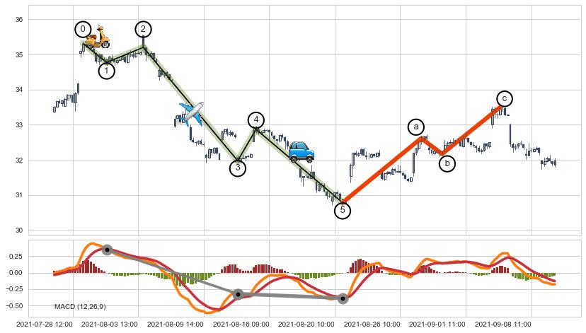 ➣ 波浪理论:猜想达到c点后小反弹终止反转下跌 → 下跌 → 【拐点】临近 → 阶段均值回复结束后继续大周期趋势跟踪
