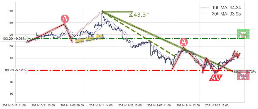 ➣ 2021-11-09 10:00-2021-12-21 11:00下跌趋势存在反转上涨[机会],其原下跌趋势的阻力位(89.21)已被突破[强支撑信号],原下跌趋势角度: 43.3˚