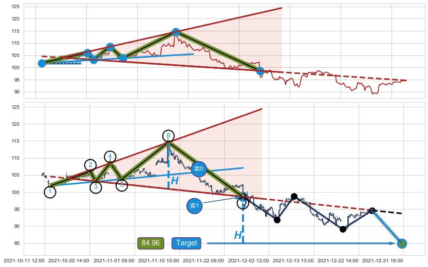 ➣ 扩散三角反转:猜想下跌target达成后 → 上涨 → 机会信号 → 大趋势均值回复