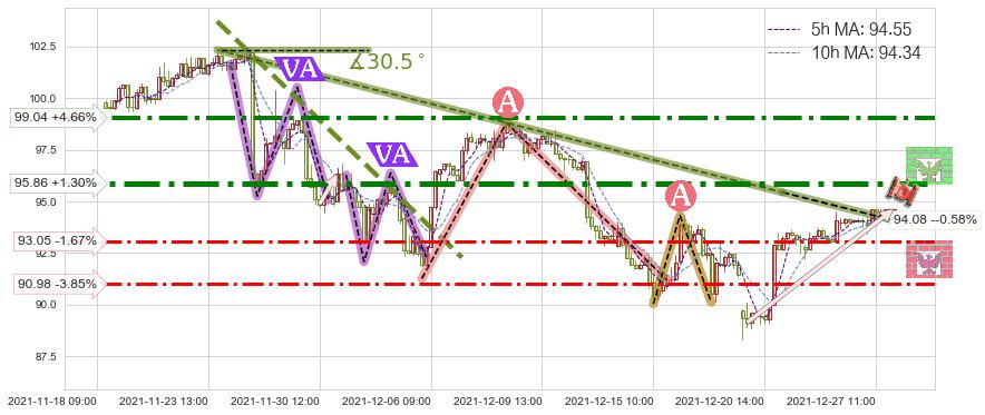 ♘ 阻力价格位95.86,可信任强度89.74%,距离最后交易2021-12-27 15:00形成的收盘价格94.63相差 +1.30%