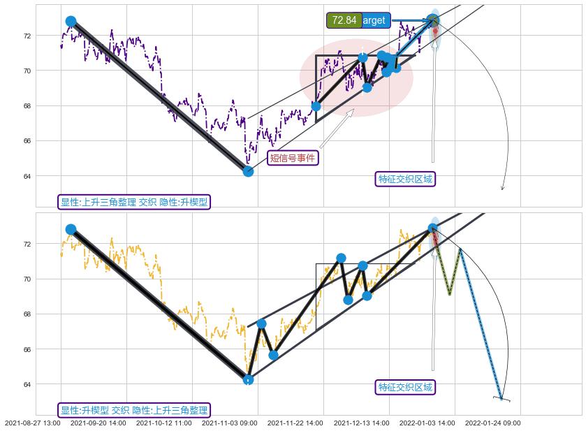 ➣ 上升三角整理:上涨目标target已达成:猜想强阻力位临近,预期回调下跌(均值回复)