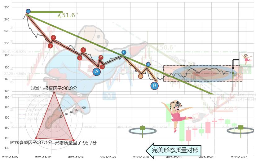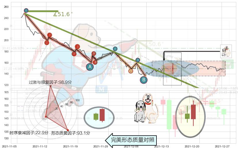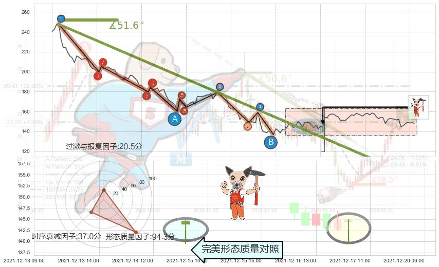 从2021-11-23 09:00至2021-12-14 13:00,共包含102个小时,阶段股价下跌-53.37%,阶段股价变动位移路程比: 1 : 3,下跌趋势角度: 51.6